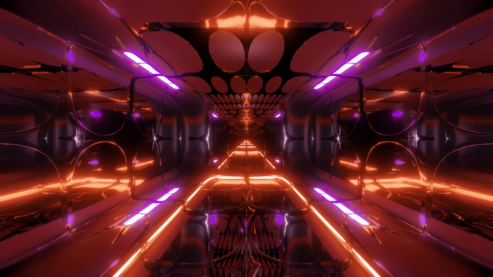 glowing futuristic horror sci-fi temple with nice reflection 3d illustration wallpaper background design, modern future religion building 3d rendering live wallpaper endless looping loop